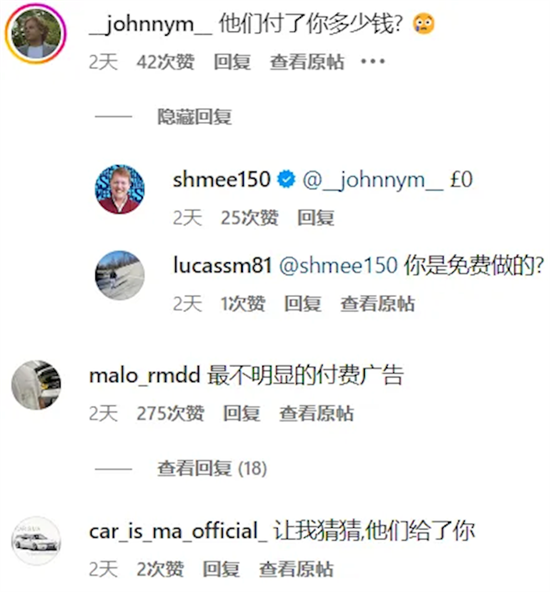 对此,shmee在评论区里直接回复道自己并没有收任何厂家的钱,自己也是免费做的视频。