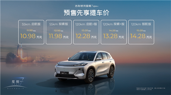 快科技11月22日消息,银河新能源官宣,品牌旗下全新插电混动SUV车型星舰7 EM-i首批量产车现已到店,日前该车已经开启预售,5款配置车型,售价区间11.98-14.28万元,先享提车价仅需10.98-14.28万元。
