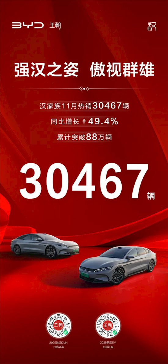 快科技12月4日消息,比亚迪近日宣布,汉家族11月销量达到30,467辆,同比增长49.4%,累计销量已突破880,000辆大关。