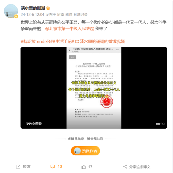 该车主在社交平台配文:“世界上没有从天而降的公平正义,每一个微小的进步都是一代又一代人,努力斗争争取而来的,@北京市第一中级人民法院 我来了”。