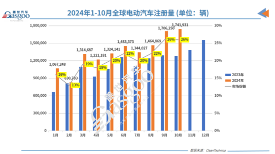 根据CleanTechnica公布的注册量数据,继9月份创下历史新高后,10月份,全球电动汽车(包括纯电动汽车和插电式混合动力汽车)注册量再接再厉,不仅同比大增36%,环比9月份也增长了2.1%,达到1,741,931辆,再次刷新了月度销量纪录,创下新的历史新高。
