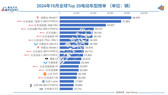 10月全球Top 20电动车品牌榜:比亚迪一家顶八家
