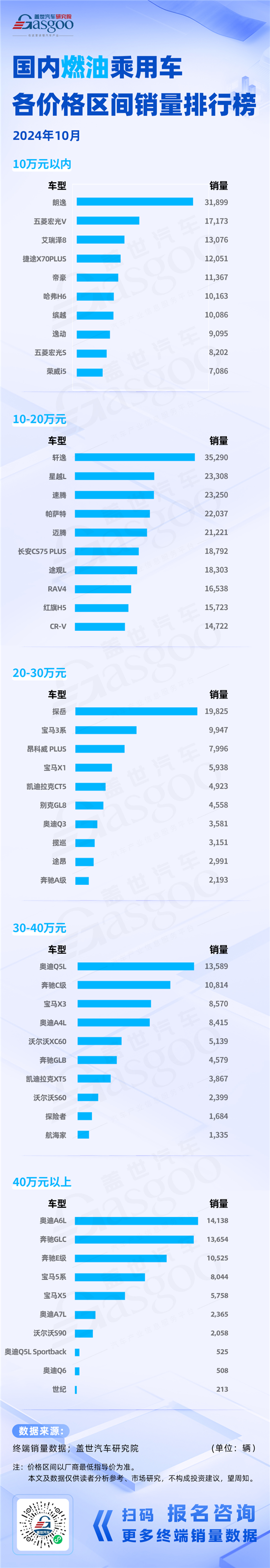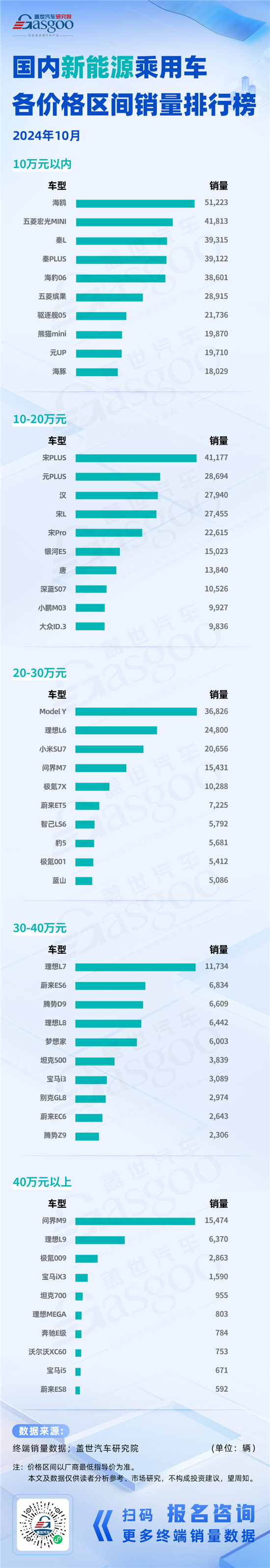 近日,盖世汽车研究院整理发布了2024年10月新能源&燃油车各价格区间销量排行榜。