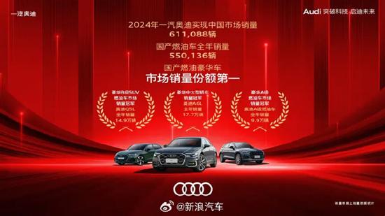 一汽奥迪2024全年累计实现整车销售611088辆,其中国产燃油车550136辆。具体来看,2024年A6L全年销量17.7万辆;2024年Q5L全年销量14.9万辆;2024年奥迪紧凑型燃油车全年销量9.9万辆。