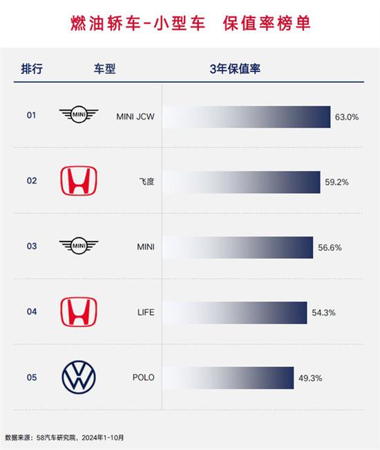 由于市面上现存的小型燃油轿车并不算多,所以能够符合数据样本量进行保值率测算的车型仅有5款,而且集中于3个品牌。其中MINI品牌的MINI JCW和MINI车型分获保值率第一和第三名,作为MINI品牌最为经典,受众也最广泛的产品,在消费者的高度认可以及品牌高含金量和合理市场经营策略等多重因素影响下,取得者这样的成绩理所应当。而本田飞度的第二名也基本上是相同的决定因素,如果去除品牌定位的因素,飞度更是小型燃油轿车中最亲民也最保值的车型。另外,它的姊妹车型LIFE也充分享受到了飞度带来的良好口碑,取得了第四名的成绩。大众的POLO尽管也是同样优秀的合资小车,但由于自身定价和终端优惠较大的原因,在数据计算上并不占优势,但对于二手车来说,其实际的保值能力也很强。