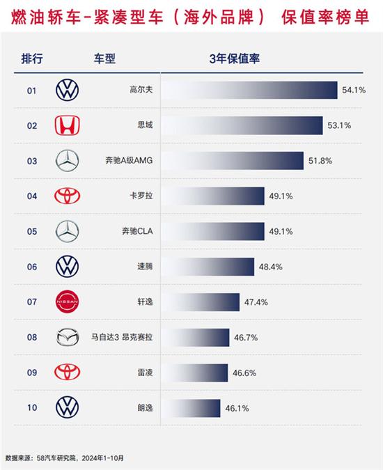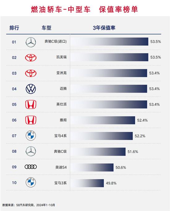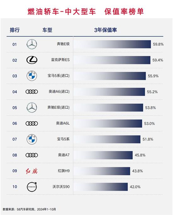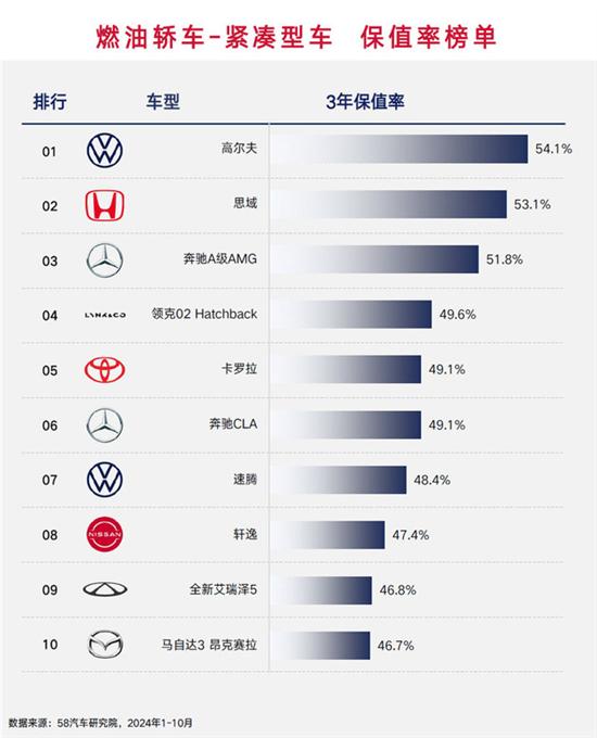 2024年底,我们58汽车研究院发布了2024中国汽车保值率研究报告,今天我们来看一看具体车型的保值率榜单,这期是传统的燃油车型(包含混合动力HEV),参考数据均为这些车型的三年保值率。