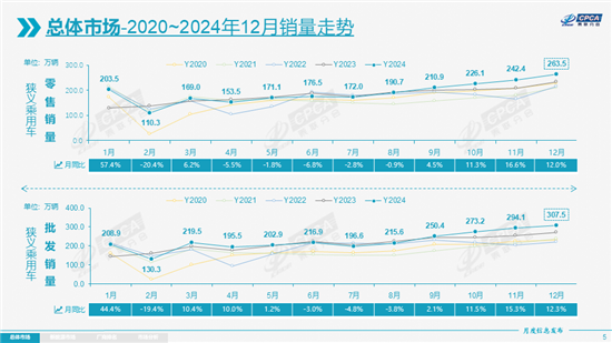 乘联分会数据显示,2024年12月,全国乘用车市场零售量达到263.5万辆,同比增长12%,环比增长8.7%。由此,2024年全年,乘用车市场累计零售量最终来到2,289.4万辆,较2023年同期增长了5.5%。
