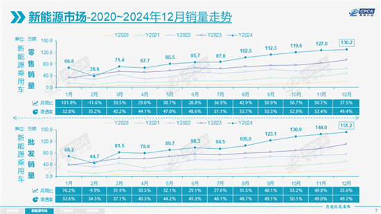 据乘联分会数据,12月新能源乘用车市场零售130.2万辆,同比增长37.5%,环比增长2.6%,2024年全年零售1,089.9万辆,同比增长40.7%。
