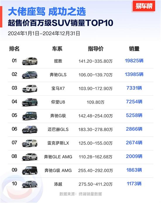 值得关注的是,在SUV销量榜单中,比亚迪仰望U8也现身其中,全年累计销售7254辆,排名榜单第四,超过奔驰G级的5258辆。仰望U8也由此成为中国百万级豪车销冠。
