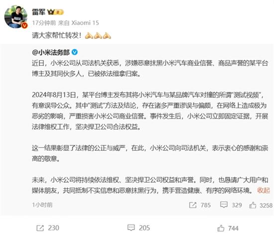 声明称,2024年8月13日,某平台博主发布其将小米汽车与某品牌汽车对撞的所谓“测试视频”,有意误导公众。其中“测试”方法及结论,存在诸多严重谬误与偏颇,在网络上造成极为恶劣的影响,严重损害小米公司商业信誉。