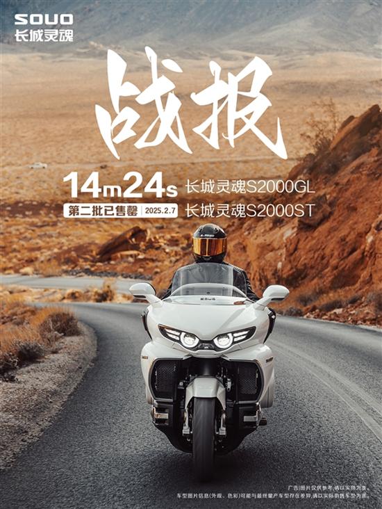 快科技2月7日消息,第二批长城灵魂摩托今日开售,耗时14分钟24秒即被抢购一空,甚至比首批开售的15分钟34秒还要快1分10秒。