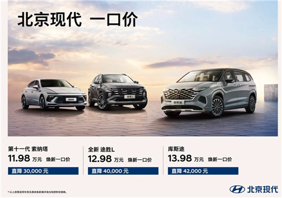 其已官宣,三款车型一口价,包括B级轿车十一代索纳塔,价格直降3万元,起售价仅11.98万起;全新紧凑型SUV途胜L,直降4万元,仅12.98万起;而中大型MPV库斯途价降价幅度最大,达到4.2万元,起售13.98万。