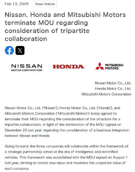 日产汽车株式会社、本田技研工业株式会社和三菱汽车株式会社今日宣布,决定终止原本计划三方合作的谅解备忘录(MOU),这一决定源于去年 12 月 23 日终止的日产与本田之间的业务整合备忘录。