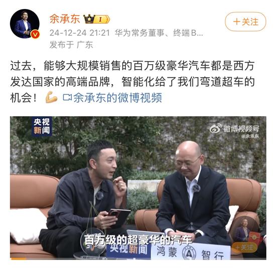 华为常务董事、终端BG董事长、智能汽车解决方案BU董事长余承东曾发文称,过去能够大规模销售的百万级豪华汽车都是西方发达国家的高端品牌,智能化给了中国品牌弯道超车的机会。