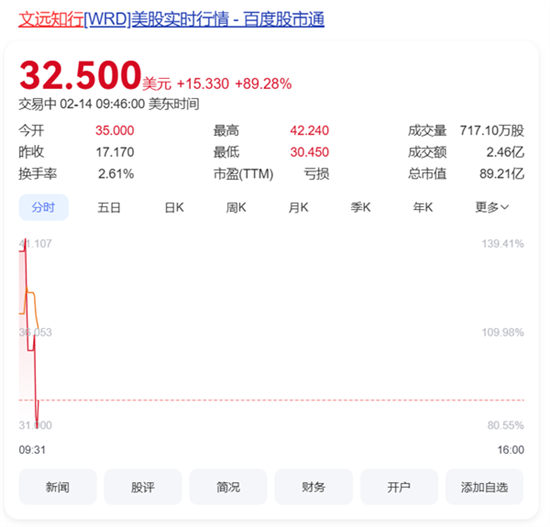 截止当前发稿,文远知行股价为32.5美元,涨幅89.28%,总市值为89.21亿美元。
