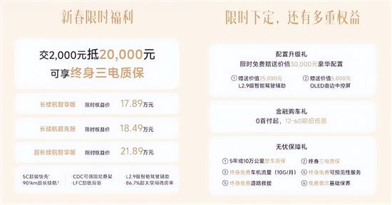 据悉,2月28日前下定岚图知音,用户可享“2000元抵20000元”的福利政策,17.89万起的价格即可入手。在此基础上,岚图知音官方还推出其他权益:
