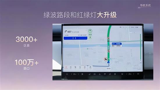 最全的红绿灯信息:在导航态与巡航态下支持红绿灯倒计时显示,并推出了“绿波车速”功能,可以根据前方信号灯状态与车速,动态推荐通过多个绿灯的最佳时速,可以绿灯畅行多个路口,提升出行效率。