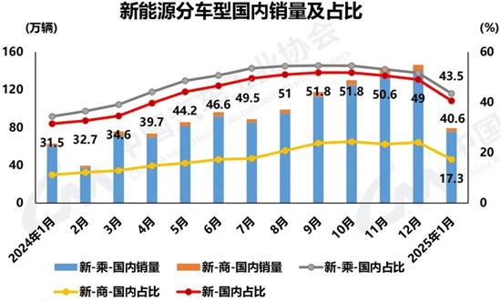 再从整个汽车市场来看,新能源车渗透率同样在去年下半年出现增长放缓,在去年9月达到最高点后,10月维稳,此后开始走低。2025年1月,新能源汽车渗透率跌至40.6%,环比下滑了8.4个百分点。
