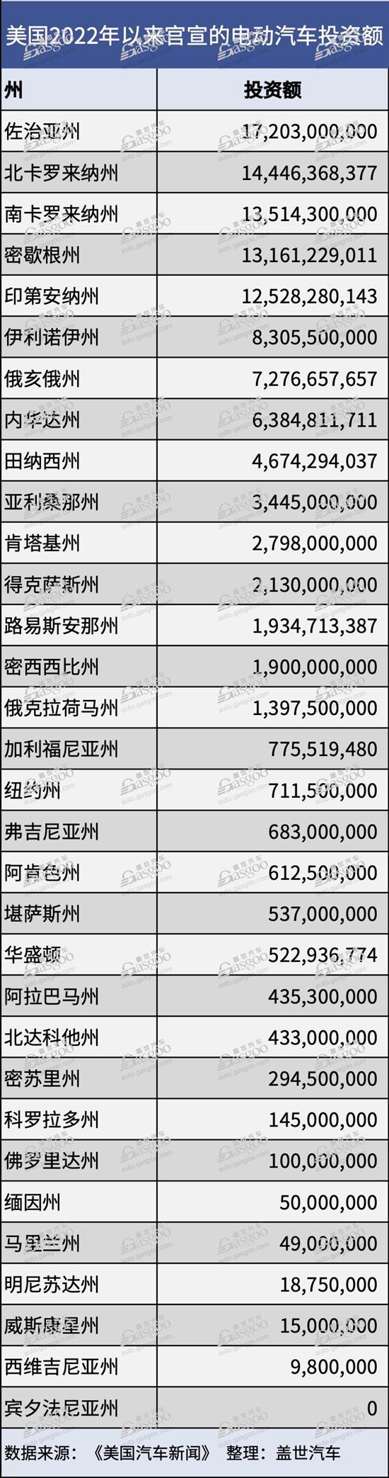 《美国汽车新闻》基于Atlas Public Policy数据做出的分析显示,自该项法案通过以来,美国宣布的电动汽车制造投资中有90%(大约1,050亿美元)流向了支持共和党的州。其中,投资额最高的州有佐治亚州(Georgia)、北卡罗来纳州(North Carolina)、南卡罗来纳州(South Carolina)、密歇根州(Michigan)和印第安纳州(Indiana),而且每个州的投资额都超过125亿美元。相比之下,宣布的投资额中仅有110亿美元流向了支持民主党的州。