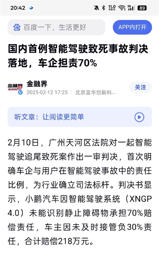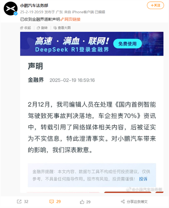 金融界在声明中称,2月12月,我司编辑人员在处理《国内首例智能驾驶致死事故判决落地,车企担责70%》资讯中,转载引用了网络媒体相关内容,后被证实为不实信息,特此澄清事实。对小鹏汽车带来的影响,我们深表歉意。