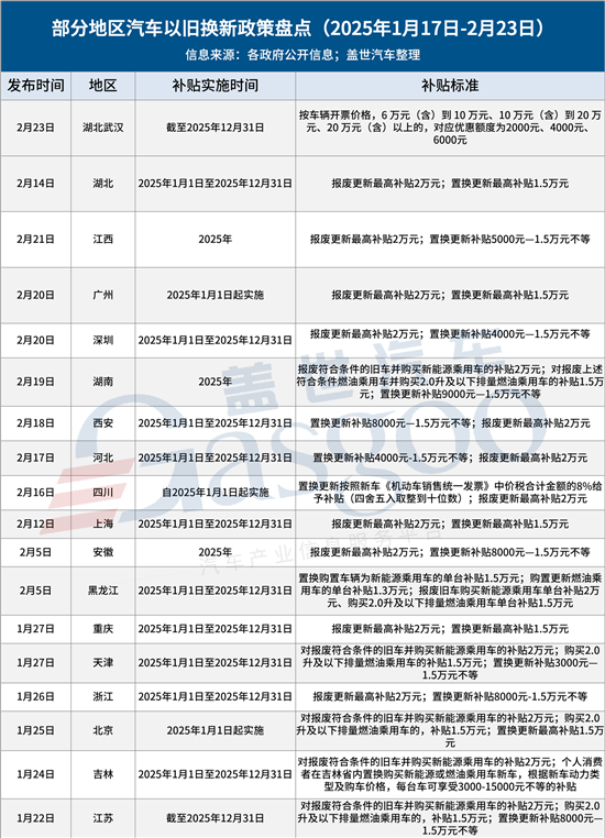 在“国补”政策出台后,全国各地积极响应,纷纷推出具体措施。据盖世汽车不完全统计,从1月中旬至2月23日期间,已有超过15个地区包括北京、上海、湖北、江苏、江西、湖南和天津等地出台相关方案,以此来激发汽车消费潜能,提振消费信心,增强消费活力。本篇是相关政策梳理,供业界参考。