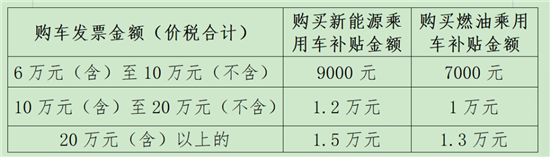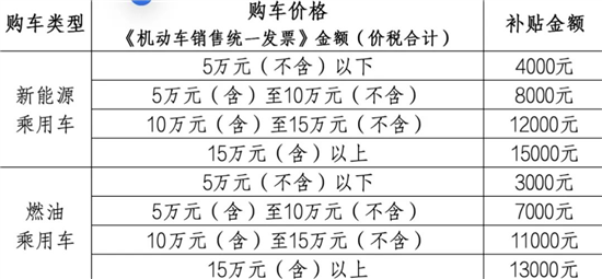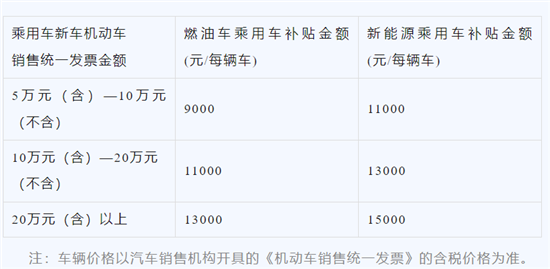 新车价格5万元(含)以上10万元(不含)以下的,燃油乘用车补贴8000元、新能源乘用车补贴10000元;新车价格10万元(含)以上20万元(不含)以下的,燃油乘用车补贴10000元、新能源乘用车补贴12000元;新车价格20万元(含)以上的,燃油乘用车补贴13000元、新能源乘用车补贴15000元。