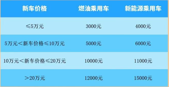 新车含税价格为5万元(含)至10万元的,燃油车每辆补贴8000元,新能源车每辆补贴1万元;10万元(含)至20万元的,燃油车每辆补贴1万元,新能源车每辆补贴1.2万元;20万元(含)以上的,燃油车每辆补贴1.3万元,新能源车每辆补贴1.5万元。