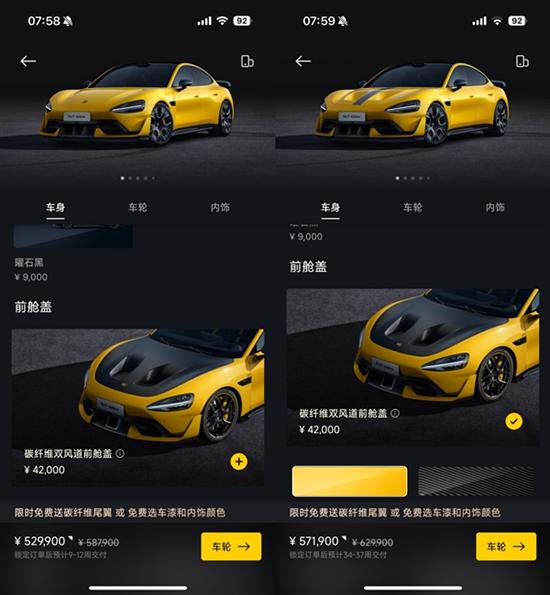 目前小米汽车APP显示,铝合金前舱盖版等车周期是9-12周,而碳纤维双风道前舱盖版等车周期是34-37周,相差了半年。