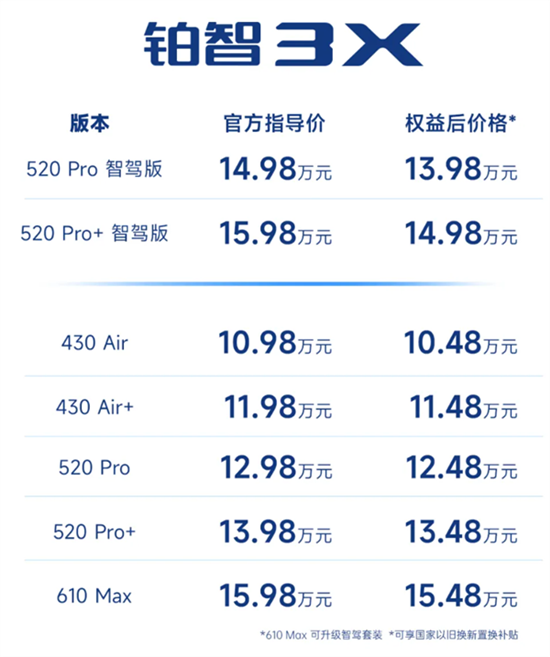 据悉,铂智3X于昨日晚间上市,共推出7款车型,权益后售价区间10.48-15.48万元。