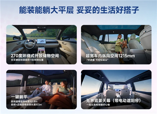 前排座椅具有“一键躺平”功能,后排座椅靠背还支持18档、20°调节、可折叠小桌板等。车内还有手机无线充电、全景天幕+电动遮阳帘、11扬声器雅马哈音响系统等舒适性配置。