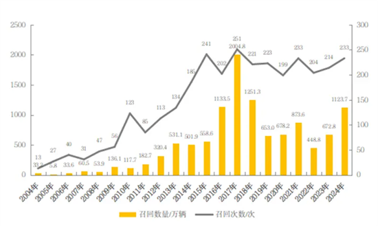 截至2024年底,我国已累计实施汽车召回3075次,涉及车辆1.14亿辆。