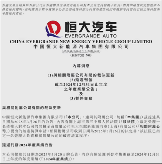 4月1日消息,恒大汽车在港交所发布公告称,其间接全资附属公司恒大恒驰新能源汽车(上海)有限公司收到上海市第三中级人民法院于3月26日发出的决定书。