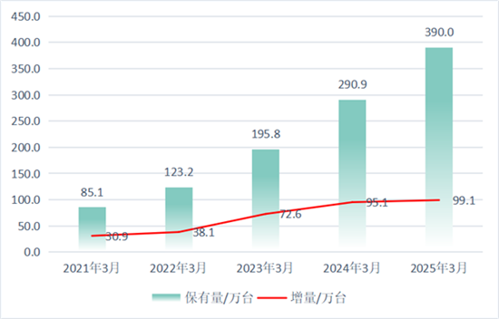 其中,公共充电桩保有量为390.0万台,包含178.5万台直流充电桩与211.4万台交流充电桩。