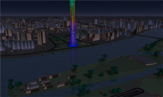 全局动态光照模型,完整呈现24小时天空动态变化,展示太阳位置、形态、光照强度及天空颜色,并基于时空状态实时计算物体真实倒影和阴影形态。