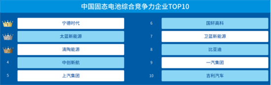根据榜单,前三名是宁德时代、太蓝新能源、清陶能源。中创新航、上汽集团也进入前五。