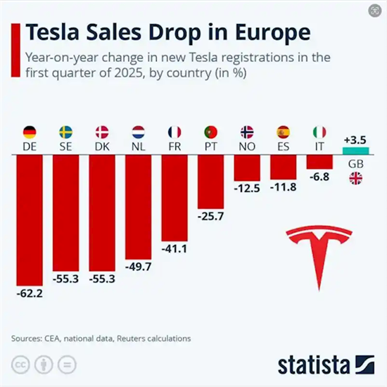 根据Statista发布的最新数据,特斯拉在欧洲的一季度全线暴跌。其中,德国、丹麦、瑞典跌幅超过50%,荷兰也接近腰斩。