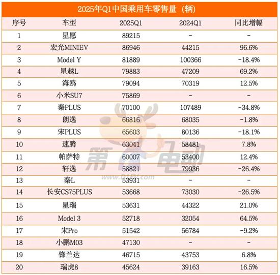 星愿、小米SU7、秦L、小鹏M03锋芒初露,成为今年Q1新晋超级黑马。与之形成鲜明对比的是,曾经的销量王秦PLUS、宋PLUS销量同比出现大降,甚至秦PLUS的降幅超34%,两者均跌落前五。