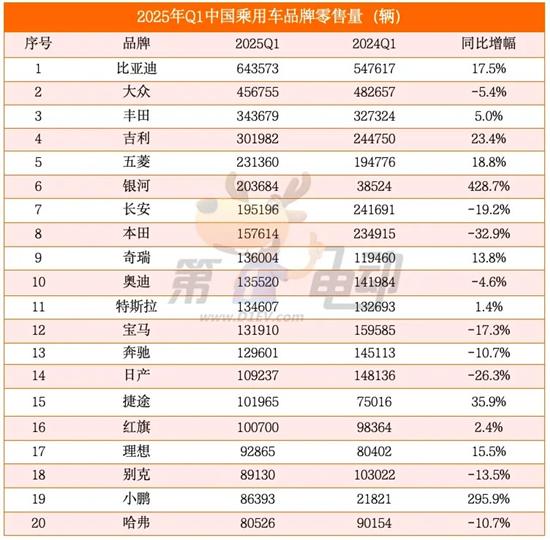 新能源品牌则展现出强劲增长势头,形成鲜明对比。银河凭借星愿、星舰 7、银河 E5 等车型热销,销量同比实现超4倍暴涨,成功跻身前十,位列第六;小鹏依靠M03、P7+、G6等车型的优异表现,销量同比近3倍增长,首次上榜便位居第19。
