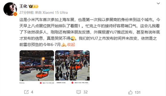 快科技4月23日消息,今日,小米集团公关部总经理王化发文辟谣小米YU7推迟发布,称YU7上市发布时间并未改变,依然是之前预告的今年6-7月。