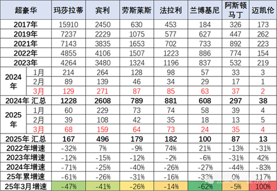 超豪华品牌中,法拉利的走势很强、宾利和劳斯莱斯表现较坚挺,虽然连续下滑,但仍在相对高位销量。玛莎的走势总体低迷,超豪华总体走弱。