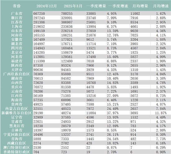 中国充电联盟统计显示,2024年底至2025年3月,全国累计新增公共充电桩32.1万台,同比增幅达75.3%。2025年一季度公共充电桩保有量为390.0万台,其中直流充电桩178.5万台,交流充电桩211.4万台;随车配建充电桩保有量为984.9万台。广东省以700255台的保有量位居榜首,江苏省、浙江省和上海市紧随其后。新疆维吾尔自治区2025年一季度增量达11084台,增速高达37.97%,表现突出。全国公共充电桩功率市场份额中,低功率充电桩占比58.9%,中低功率段占比34.5%,高功率段占比6.7%。