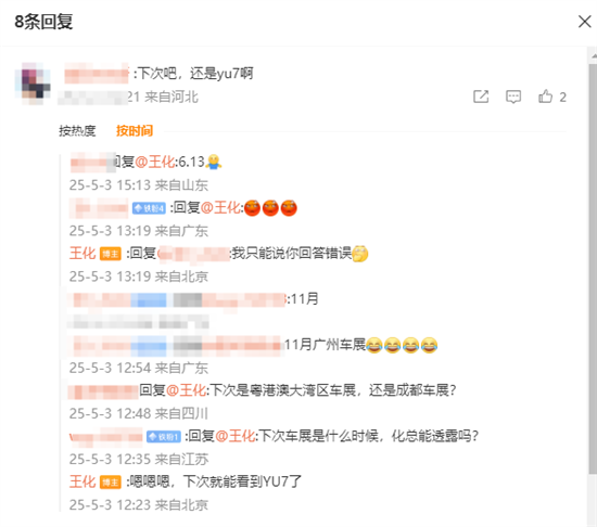 在对应的微博评论区,有网友给王化留言“下次吧,还是YU7啊”。对此王化回复“嗯嗯嗯,下次就能看到YU7了”。