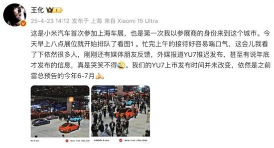 王化也在车展首日发文表示:“刚刚还有媒体朋友反馈,外媒报道YU7推迟发布,甚至有说年底才发布的信息,真是哭笑不得。我们的YU7上市发布时间并未改变,依然是之前雷总预告的今年6-7月。”