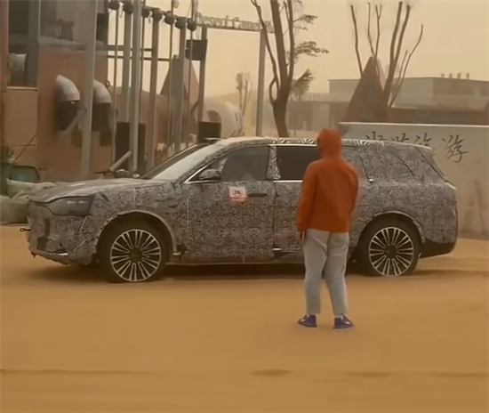 虽然车身上覆盖有厚厚的伪装,从车头大灯来看,这款车基本就是问界M9,但它又和M9有区别,最典型的就是车身长度显著被加长,主要体现在后门到车尾这一部分。