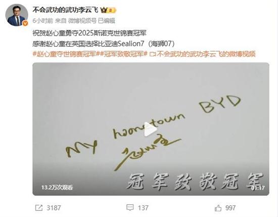 比亚迪李云飞等高管发微博,祝贺赵心童勇夺2025斯诺克世锦赛冠军,并感谢赵心童在英国选择比亚迪sealion7(海狮07)。