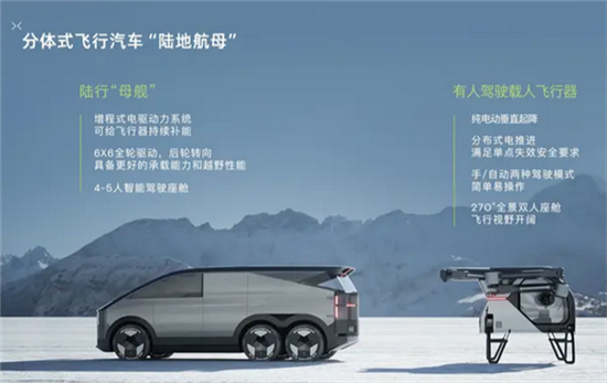 据悉,“陆地母体”采用3轴6轮设计,长宽高分别约为5.5米、2米、2米,搭载全域800V碳化硅高压增程平台,续航里程超1000公里,同时能在行驶和停车时为飞行器充电,支持5-6次飞行。