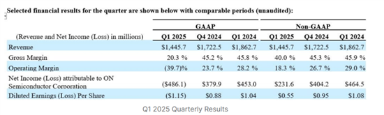 5月5日,美国芯片制造商安森美(Onsemi)公布,按非GAAP计算,今年第一季度,其营收为14.457亿美元,较去年同期的18.627亿美元下滑22%,但超出了预期的14亿美元;毛利率为40.0%,低于去年同期的45.9%;营业利润率为18.3%,低于去年同期的29.0%;净利润为2.316亿美元,低于去年同期的4.645亿美元;摊薄后每股收益为0.55美元,低于去年同期的1.08美元;运营现金流达6.02亿美元,其中自由现金流同比增长72%至4.55亿美元,占营收的31%。