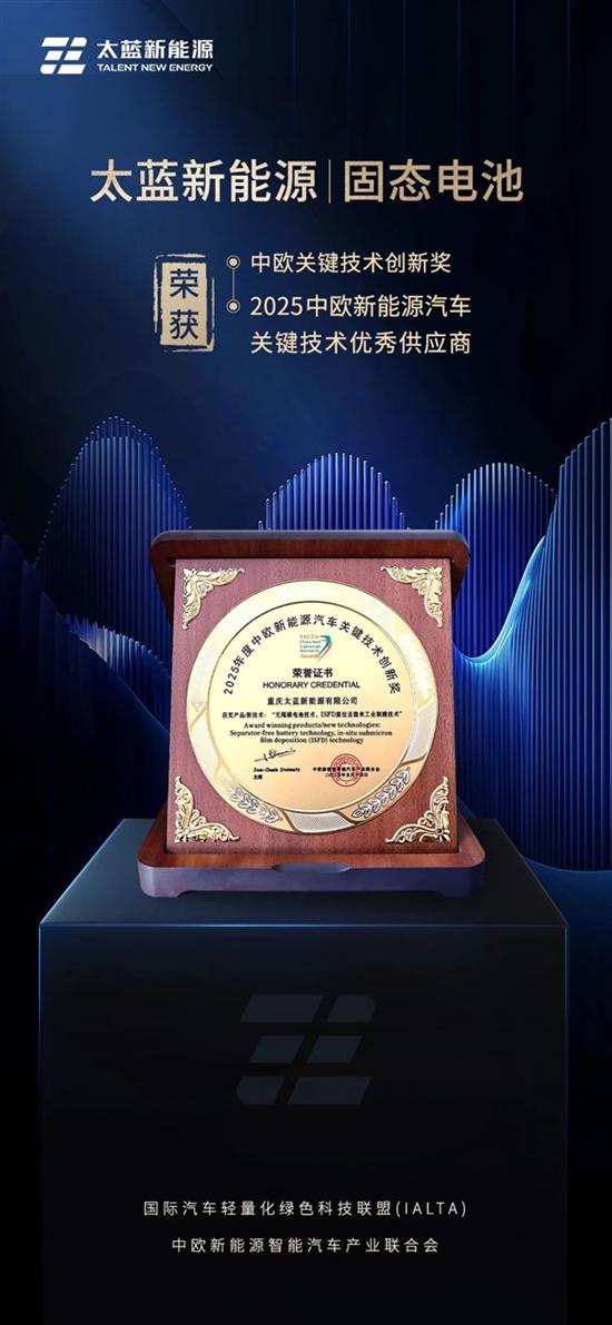 太蓝新能源宣布,公司凭借自主研发的固态电池原位亚微米工业制膜技术(ISFD),成功斩获“2025年度中欧新能源汽车关键技术创新奖”。
