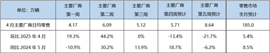 第3周,乘用车日均零售预计为5.12万辆,同比增长13.9%,环比持平,属节后正常回落;第4周预计日均零售5.71万辆,同比增长18.7%,环比下降13.4%,市场热度温和回落;5月最后一周共有5个工作日,预计日均零售8.64万辆,同比下滑6.2%,环比下降21.7%。