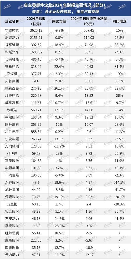 从2024年财报来看,无论是狂赚超500亿的宁德时代,还是净利暴涨超5倍的双林股份,抑或是业绩表现较为突出的福耀玻璃、拓普集团、德赛西威等,都共同印证了新能源与智能化发展对业绩提升的关键作用。